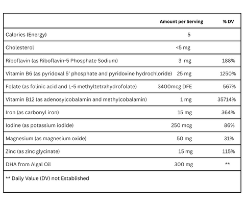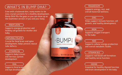 Bump DHA contains natural folate (MTHFR), DHA, Riboflavin, Vitamin B6, Vitamin B12, Iron, Iodine, Magnesium, and Zinc.